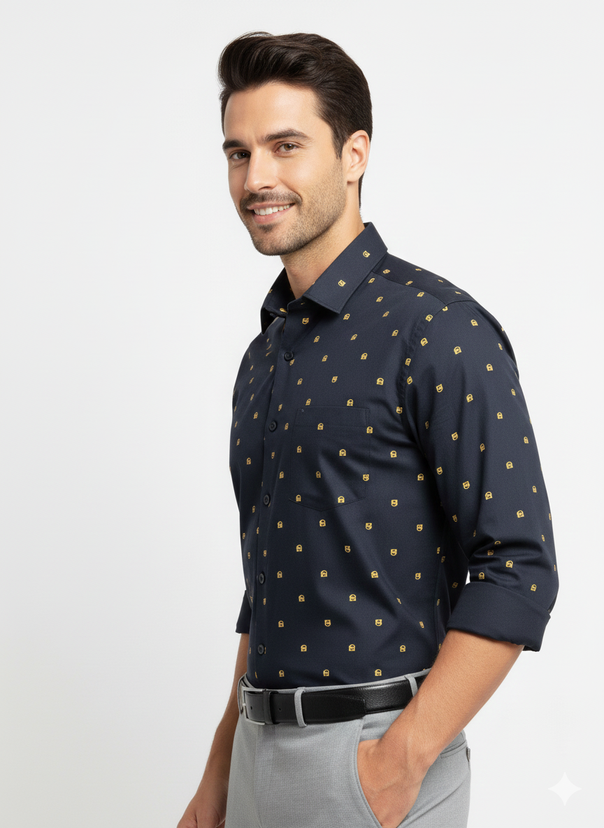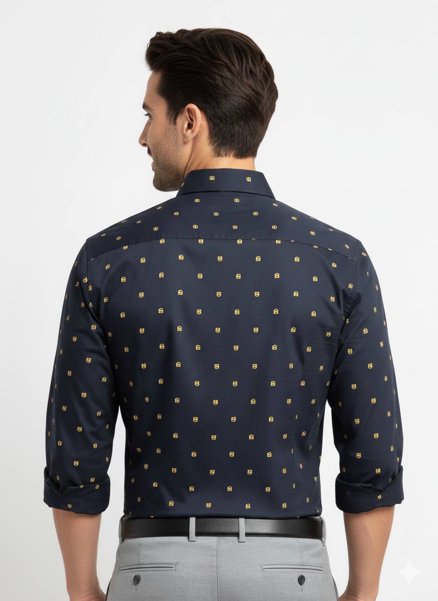 Step into any meeting with confidence in our Charcoal Micro-Pattern Formal Shirt. This sophisticated piece features a deep charcoal or navy base accented with a subtle, geometrically aligned micro-dot pattern, adding rich texture and visual interest without being distracting.